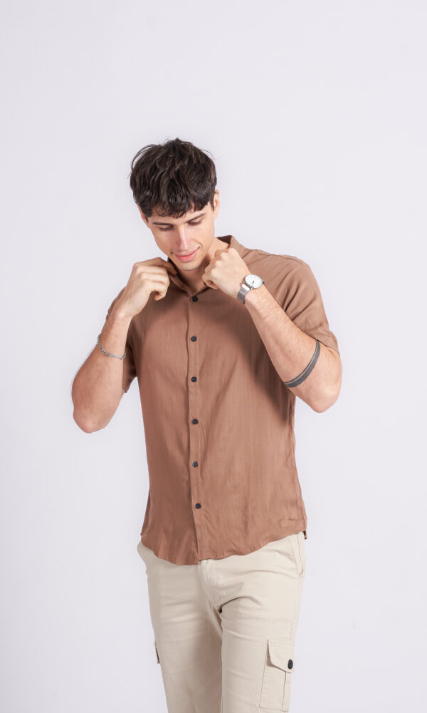 El tejido liso y natural la convierte en una opción versátil, perfecta tanto para eventos casuales como para ocasiones más formales. Ya sea combinada con pantalones de lino o jeans, esta camisa eleva cualquier look con su sofisticada simplicidad